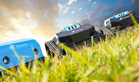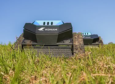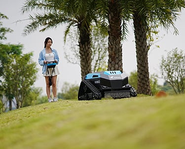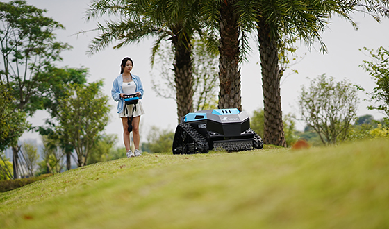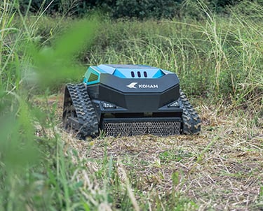 The KOHAM lawn mower adopts a track design, which allows it to work easily on hillsides where people can hardly walk.